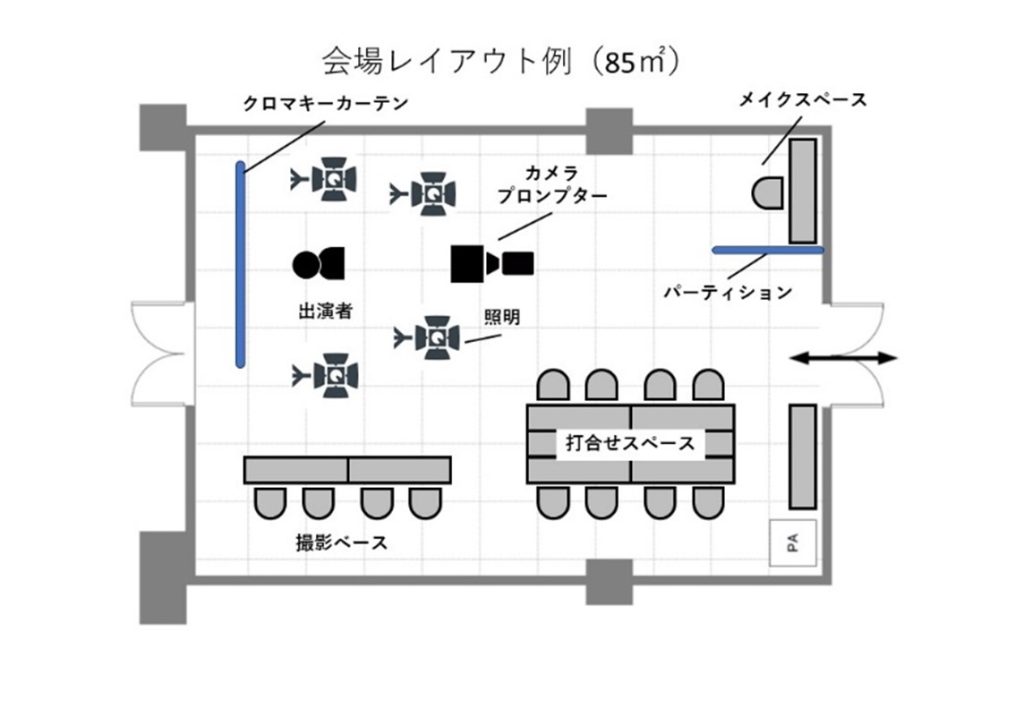 撮影・照明機材を設置する撮影スペース、立会い者や出演者の打合せスペースなどを考慮すると、80㎡以上の広さが理想的です。